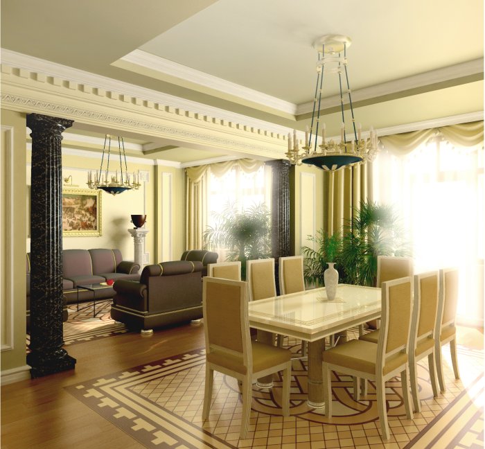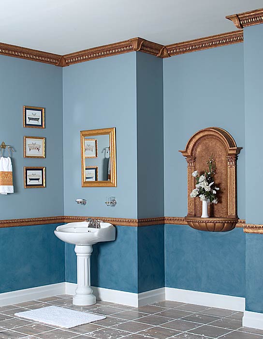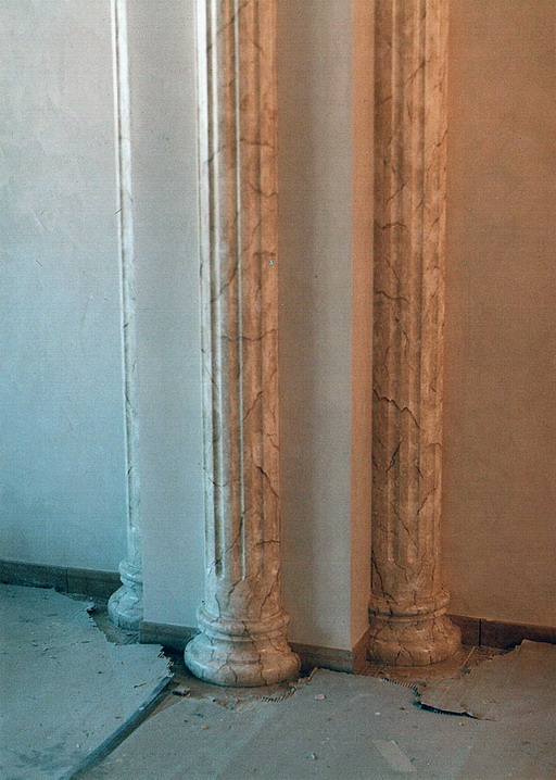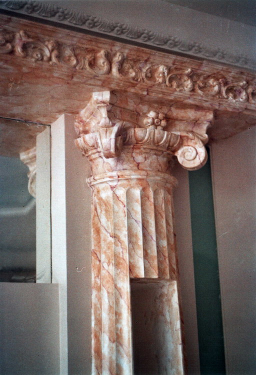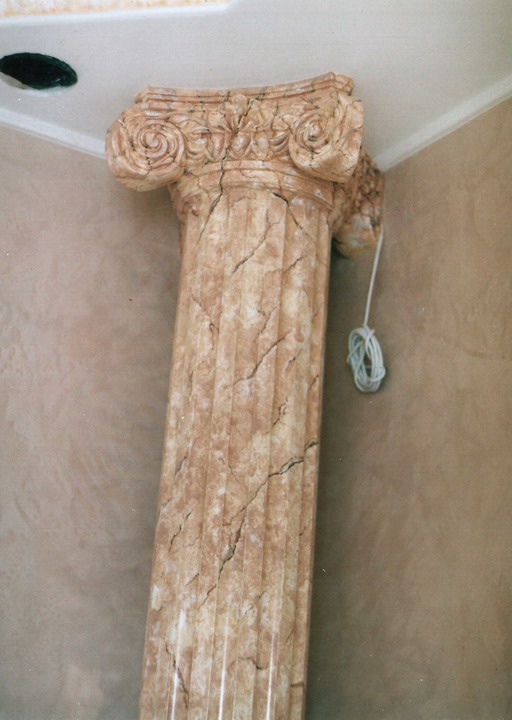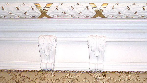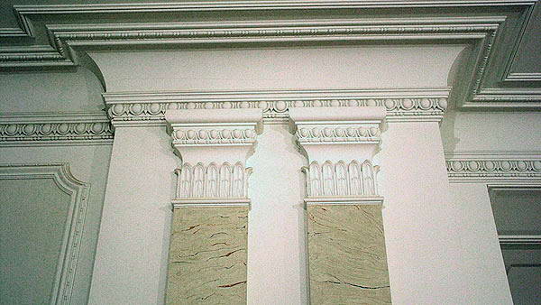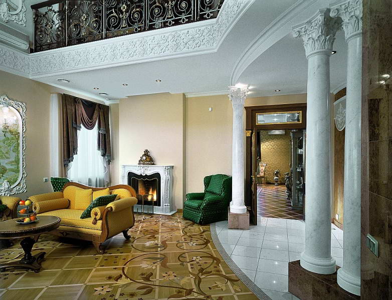 Художественная отделка, колорирование, тампонирование, золочение лепниныВ этой галерее представлены примеры работ по художественному оформлению лепного декора и примеры создания красивых интерьеров с применением тонированых, тампонированых карнизов, розетт или молдингов. Иммитация колонн и пилястр "под мрамор" настолько реалистична, что не зная о применении в их качестве полиуретановых декоров, они принимаются за натуральный мрамор в девяносто девяти случаев из ста. Многие интерьеры очень богаты, их можно взять за некий шаблон, а можно позаимствовать отдельные приемы применения различных лепных декоров, таких как колонны, пилястры, ниши, дверные обрамления, купола, молдинги и карнизы. Декоративная лепнина прекрасно сочетается с фресками или ручной росписью, веницианской штукатуркой, натуральным паркетом |