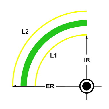 ![]() Изображение элемента, размеры и цена ER - наружный радиус; IR - внутренний радиус; L1 - длина дуги (четверть окружности) по внутреннему радиусу; L2 - длина дуги (четверть окружности) по наружному радиусу |