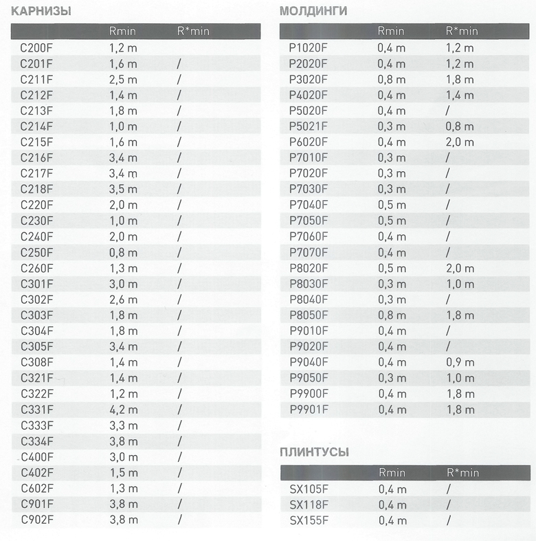 Разделы: Лепнина Орак флексы, гибкие карнизы, гибкие молдинги, таблица радиусов |